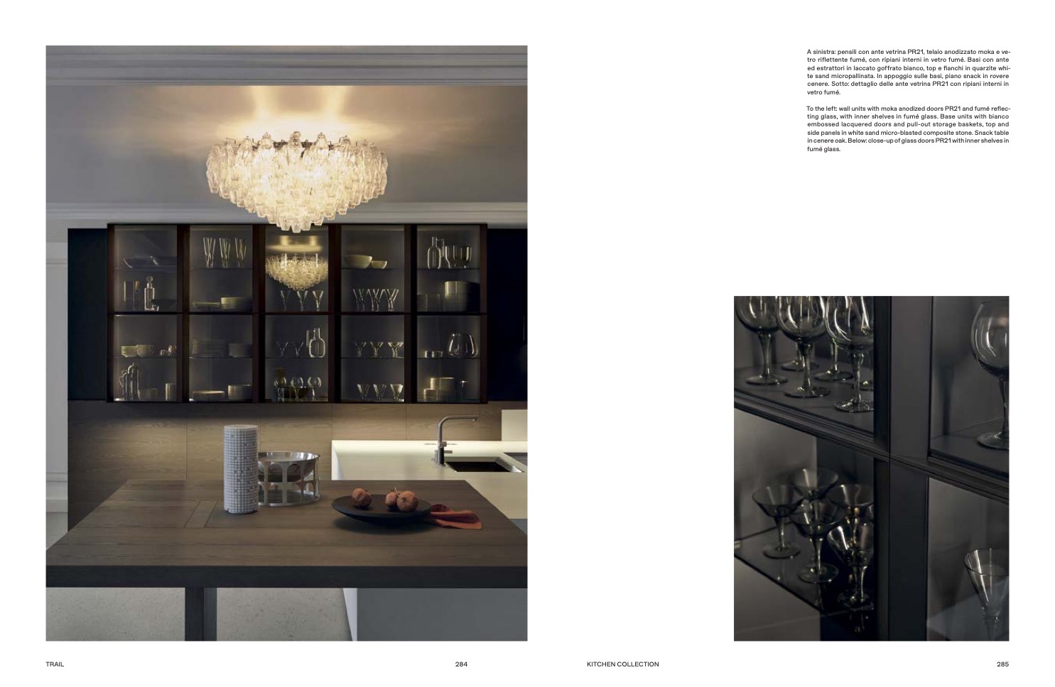 cenere. Sotto: dettaglio delle ante vetrina PR21 con ripiani interni in