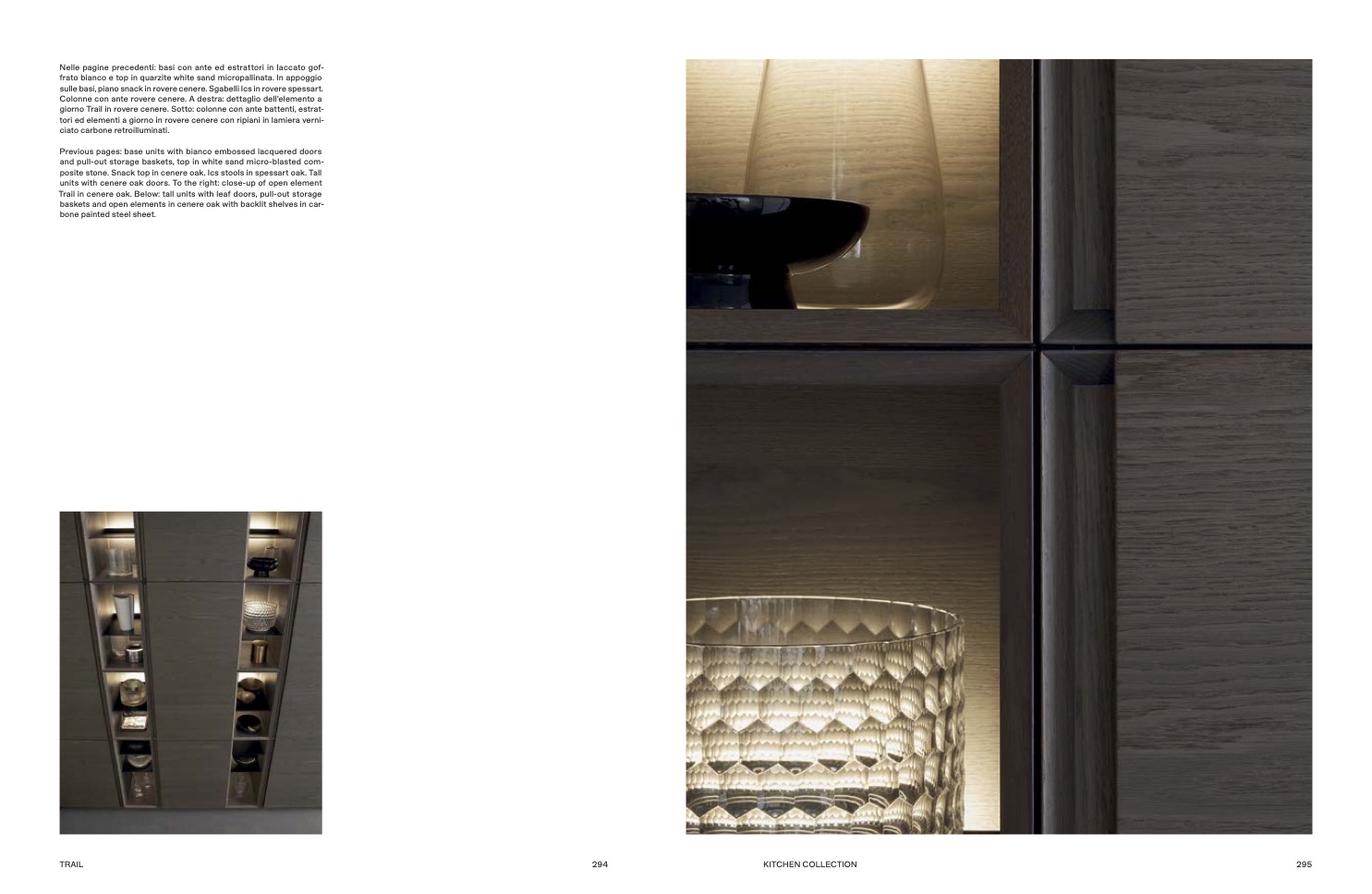 Trail in cenere oak. Below: tall units with leaf doors, pull-out storage