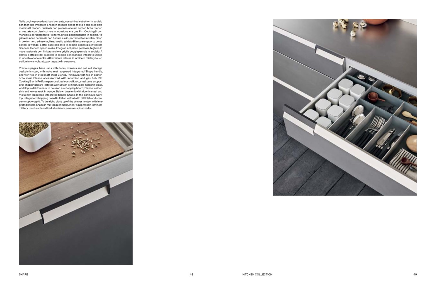 destra: dettaglio del cassetto in acciaio con maniglia integrata Shape