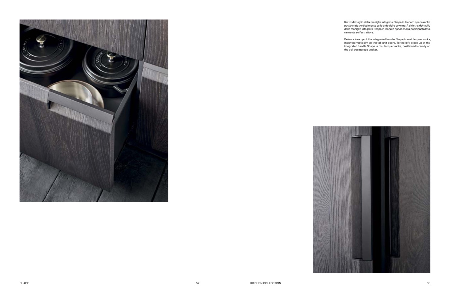 Below: close up of the integrated handle Shape in mat lacquer moka,