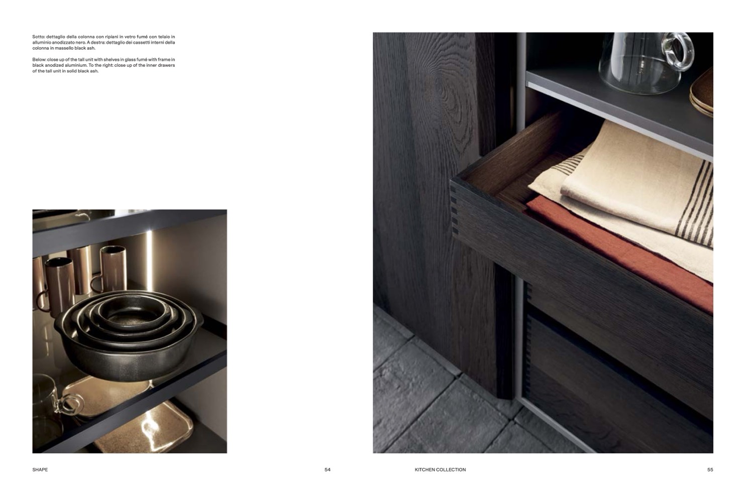 alluminio anodizzato nero. A destra: dettaglio dei cassetti interni della