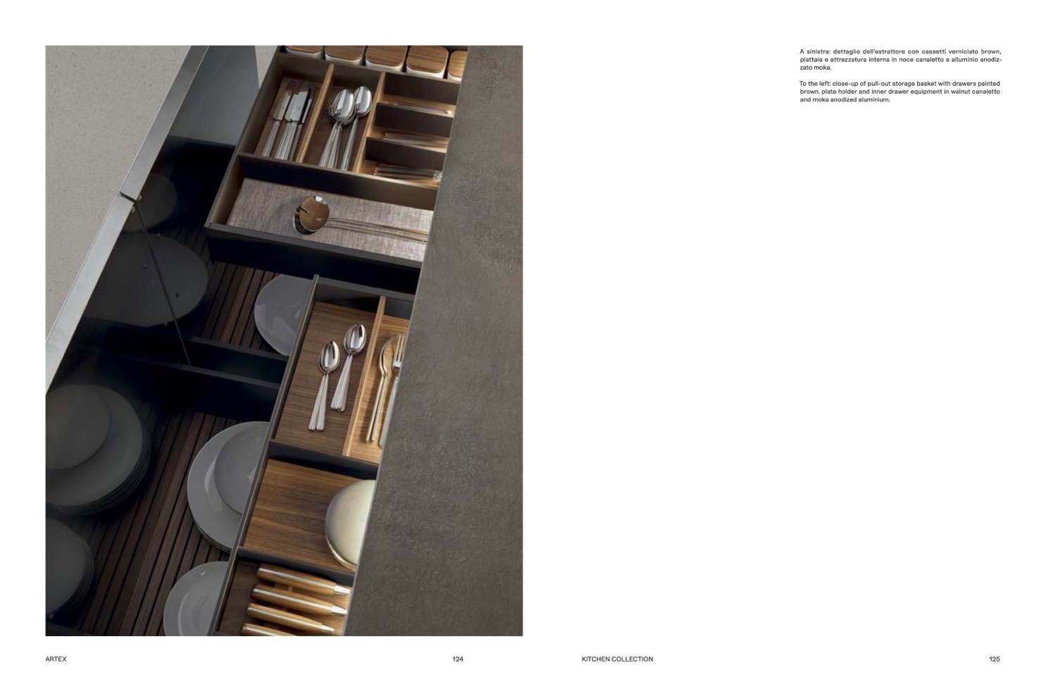 A sinistra: dettaglio dell’estrattore con cassetti verniciato brown,
