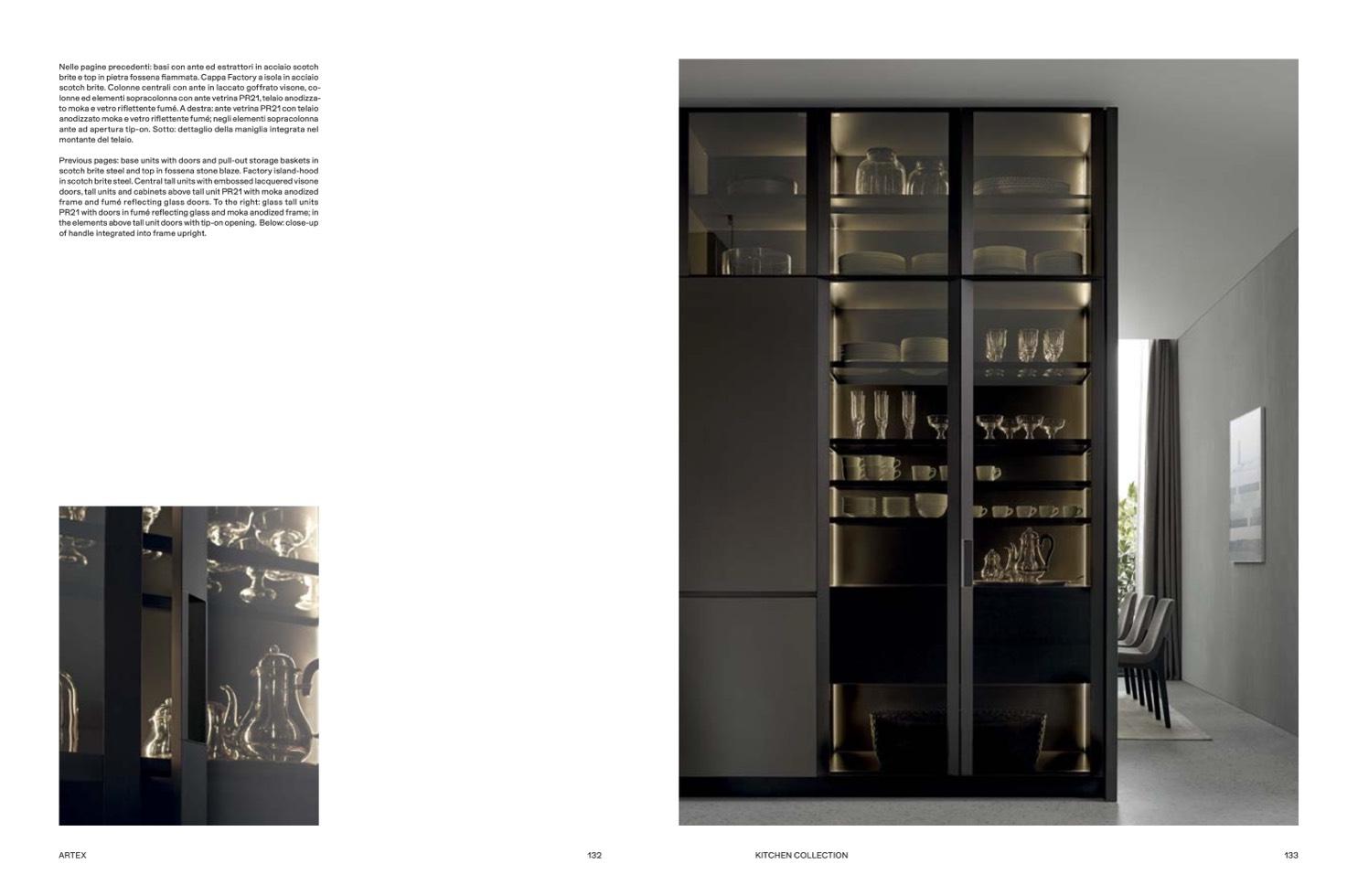 to moka e vetro riflettente fumé. A destra: ante vetrina PR21 con telaio