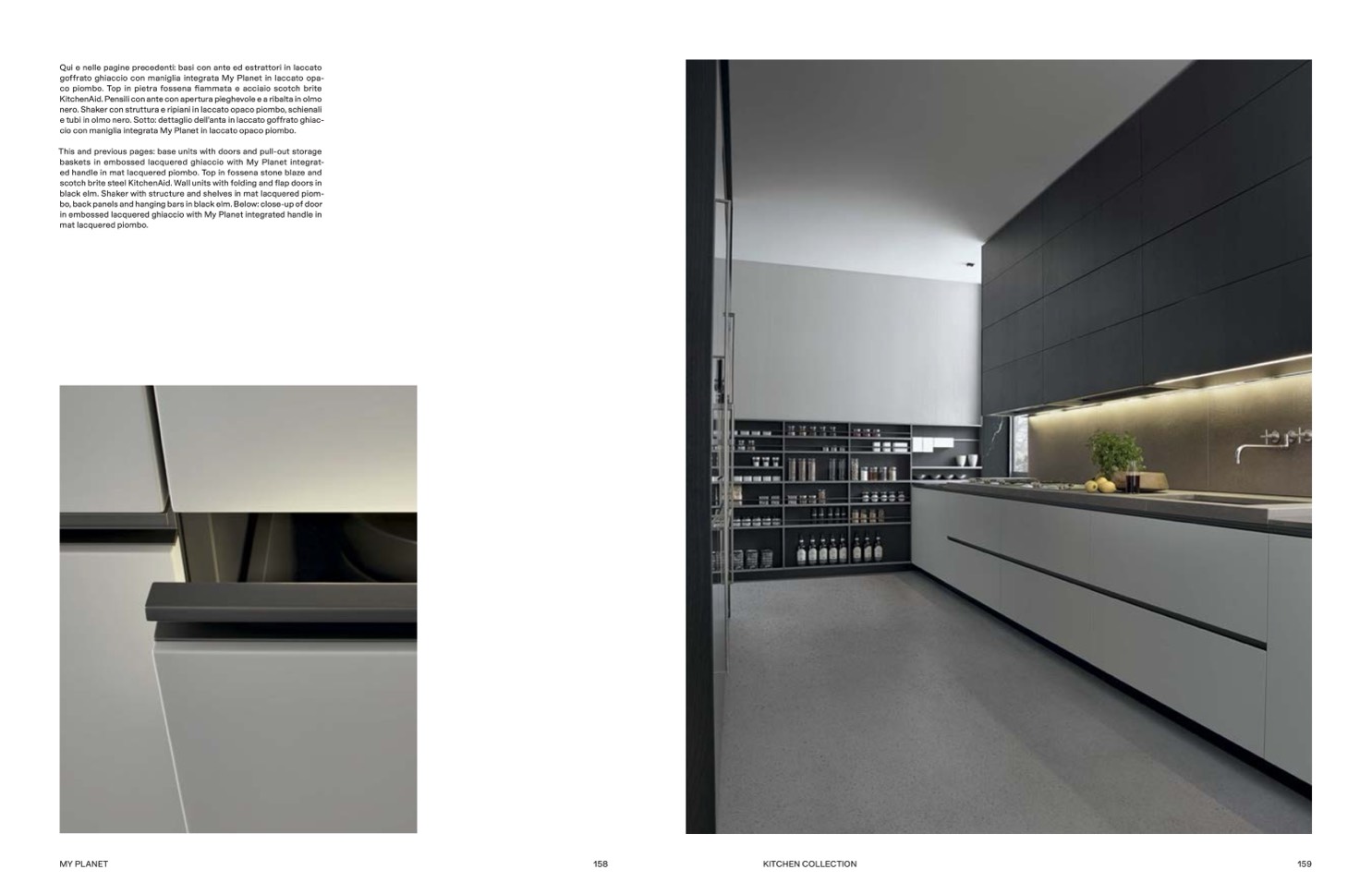 Qui e nelle pagine precedenti: basi con ante ed estrattori in laccato