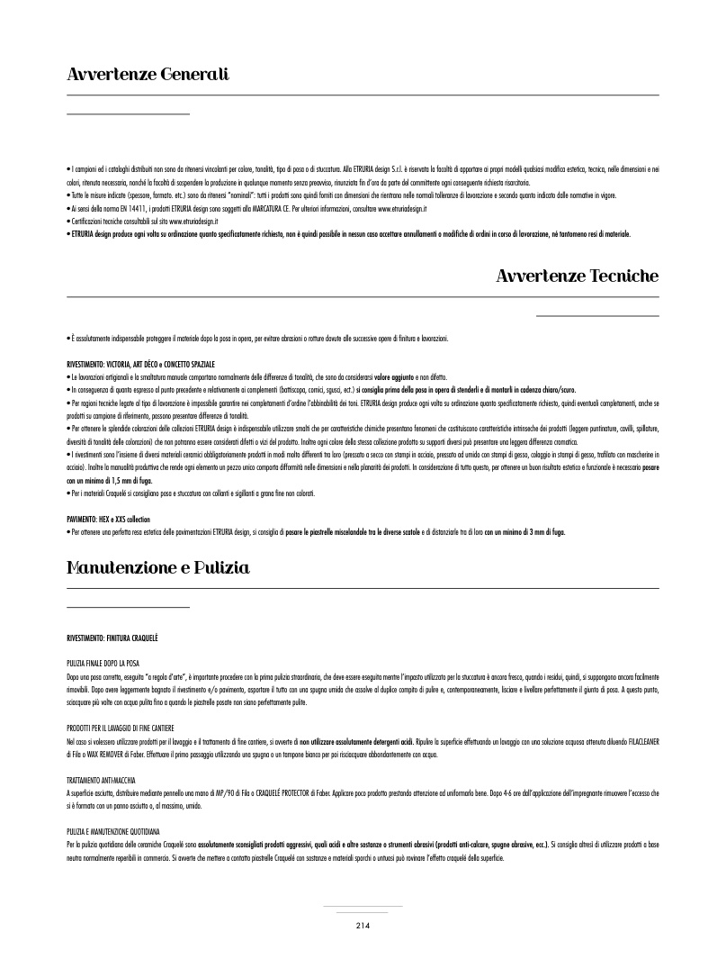 • I campioni ed i cataloghi distribuiti non sono da ritenersi vincolanti per colore, tonalità, tipo di posa o di stuccatura. Alla ETRURIA design S.r.l. è riservata la facoltà di apportare ai propri modelli qualsiasi modifica estetica, tecnica, nelle dimensioni e nei
