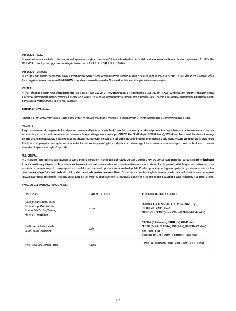 alla chiusura dei giunti. In questa fase il pavimento deve essere lavato con un detergente acido appositamente studiato quale: DETERDEK (Fila), KERANET (Mapei), DELTAPLUS (Kerakoll), VIAKAL (Procter&Gamble) o simili. Per evitare che il prodotto, a