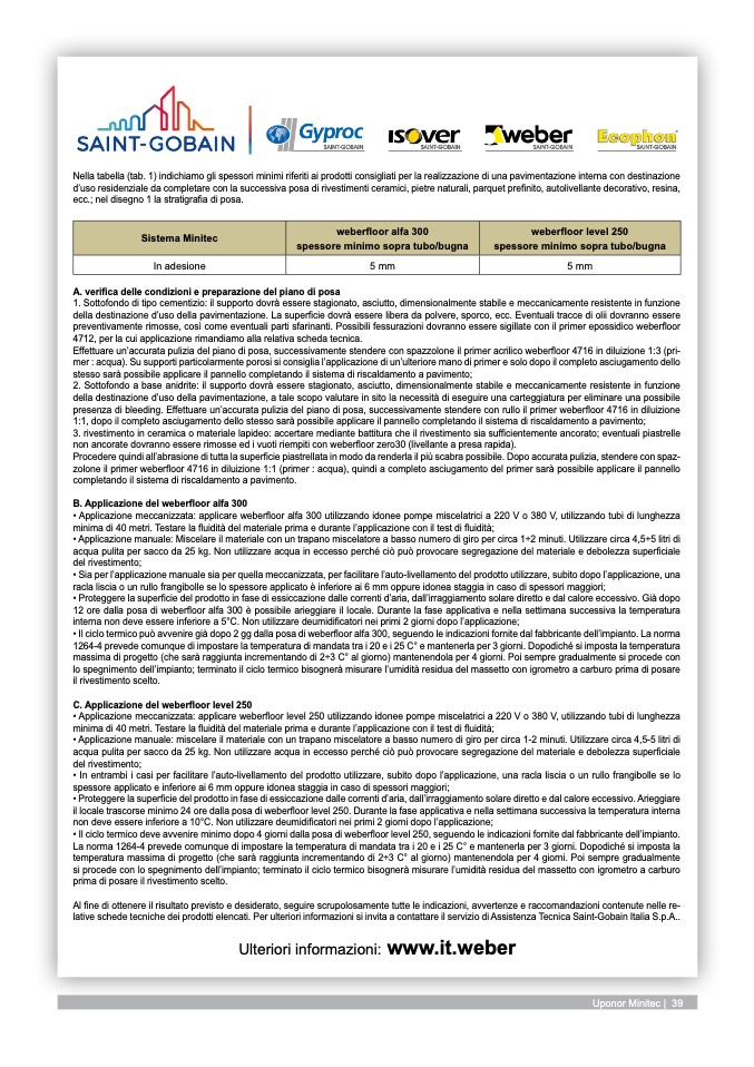 • Il ciclo termico può avvenire già dopo 2 gg dalla posa di weberfloor alfa 300, seguendo le indicazioni fornite dal fabbricante dell’impianto. La norma
