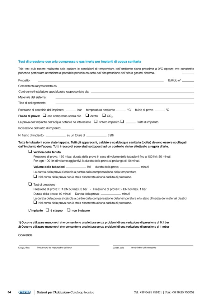 Pressione di prova: 150 mbar, durata della prova in caso di volume delle tubazioni fino a 100 litri: 30 minuti.