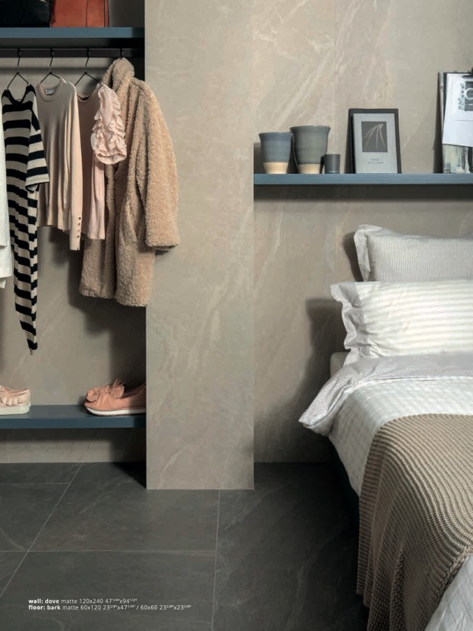 floor: bark matte 60x120 235/8”x471/4” / 60x60 235/8”x235/8”