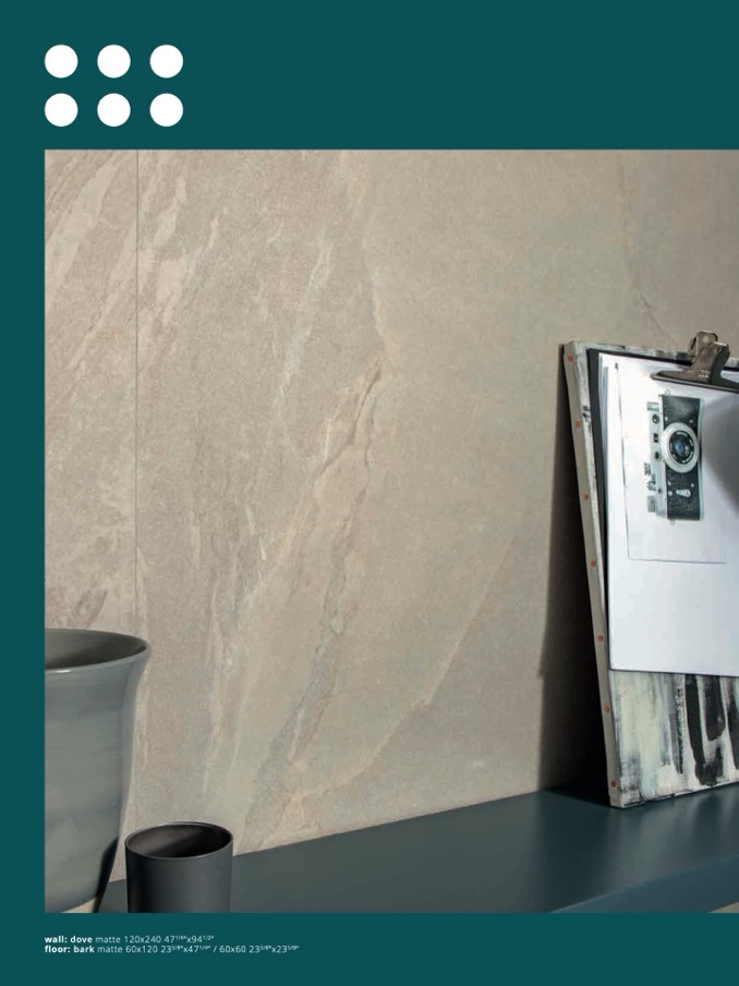 floor: bark matte 60x120 235/8”x471/4” / 60x60 235/8”x235/8”