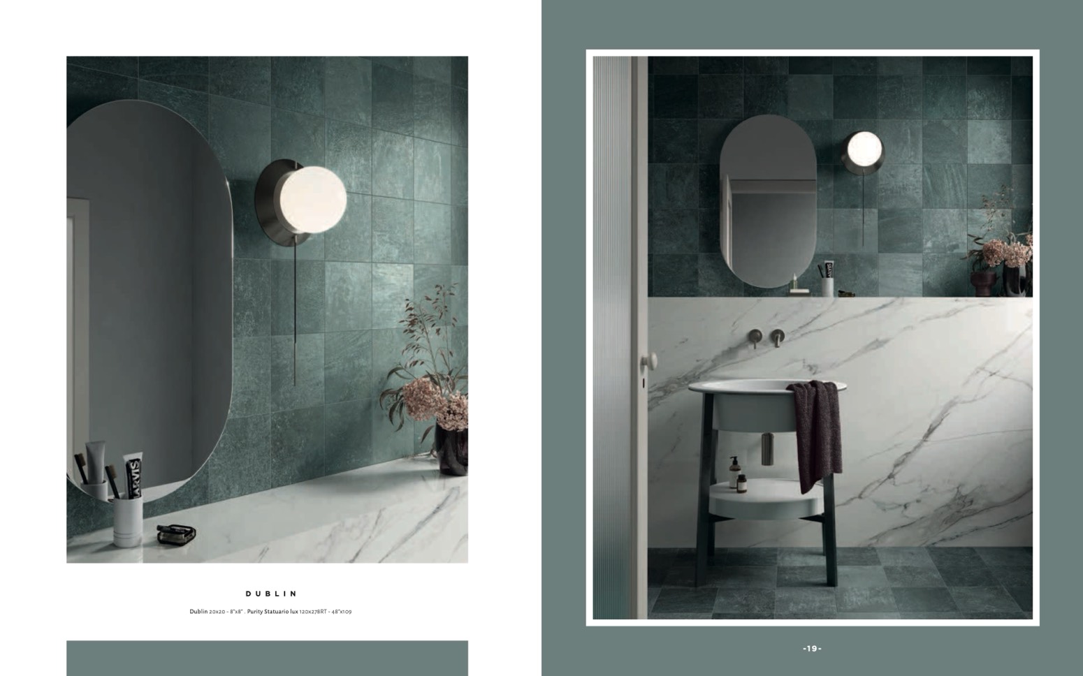 Dublin 20x20 - 8”x8” . Purity Statuario lux 120x278RT - 48”x109