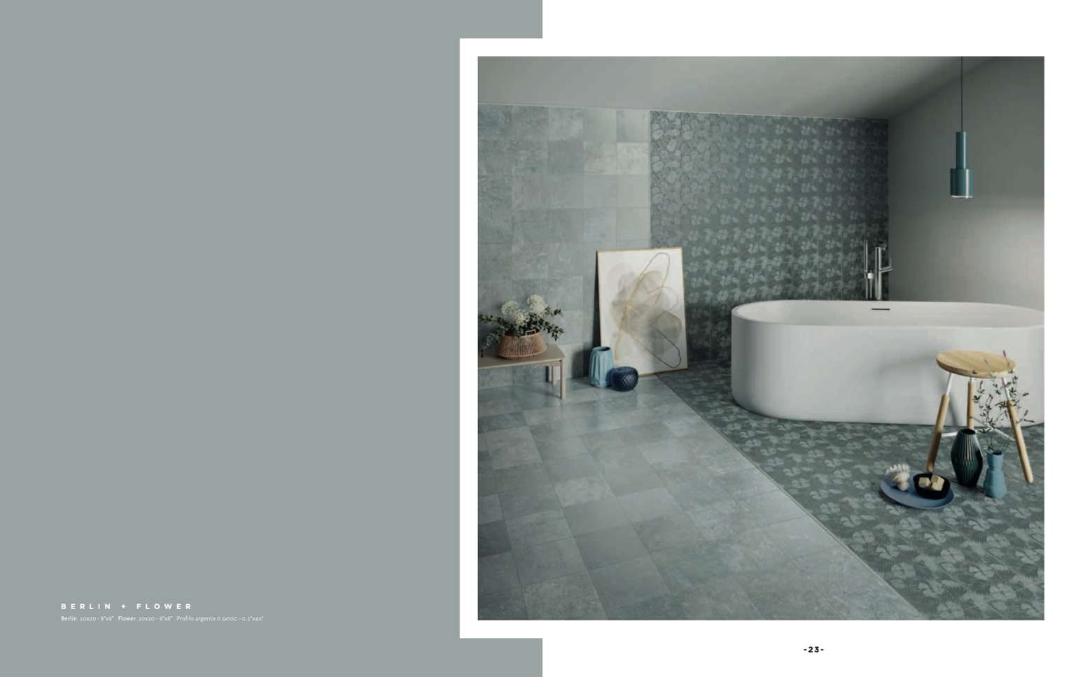 Berlin. 20x20 - 8”x8” . Flower. 20x20 - 8”x8” . Profilo argento 0.5x100 - 0.2”x40”