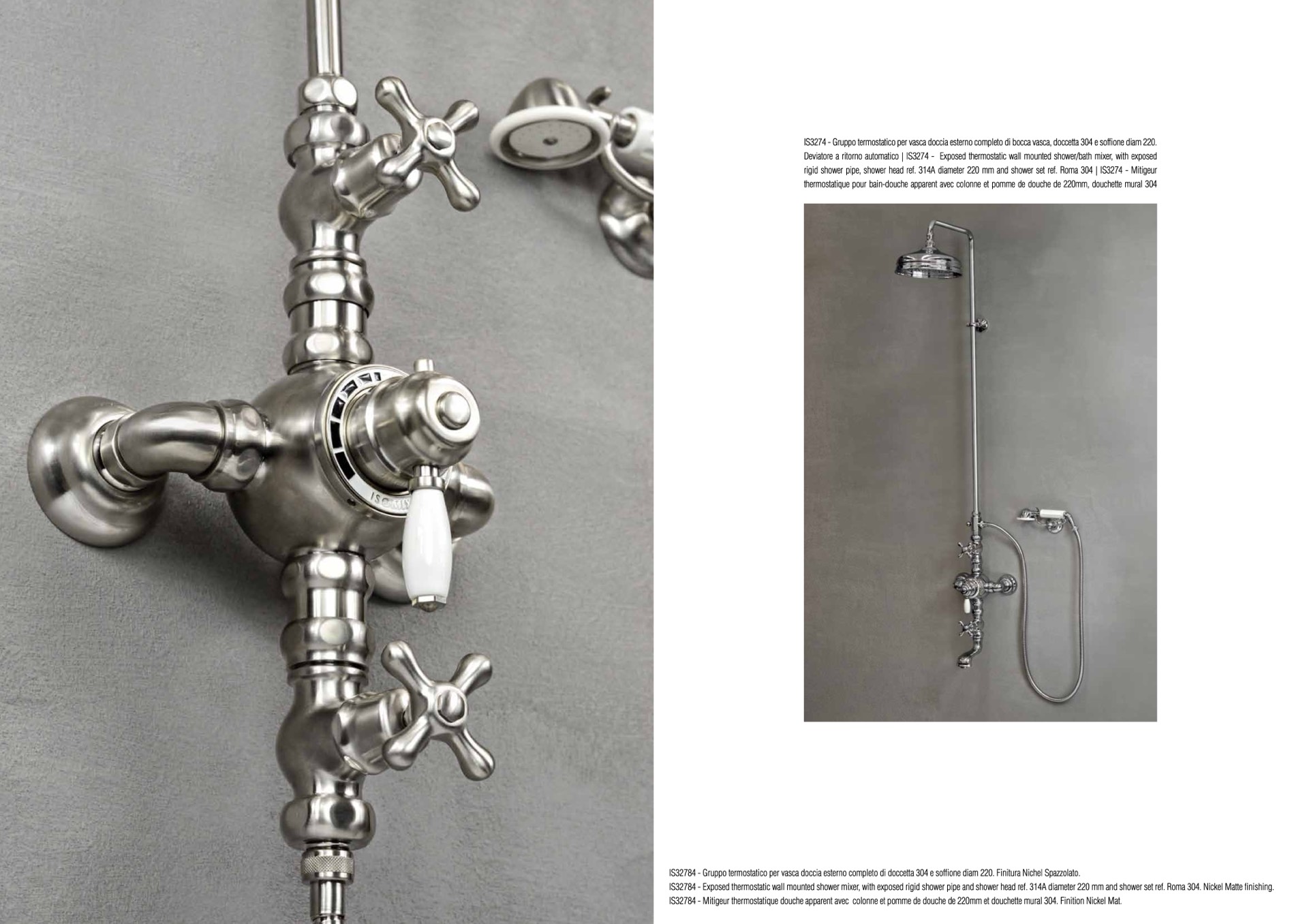 IS32784 - Exposed thermostatic wall mounted shower mixer, with exposed rigid shower pipe and shower head ref. 314A diameter 220 mm and shower set ref. Roma 304. Nickel Matte finishing.