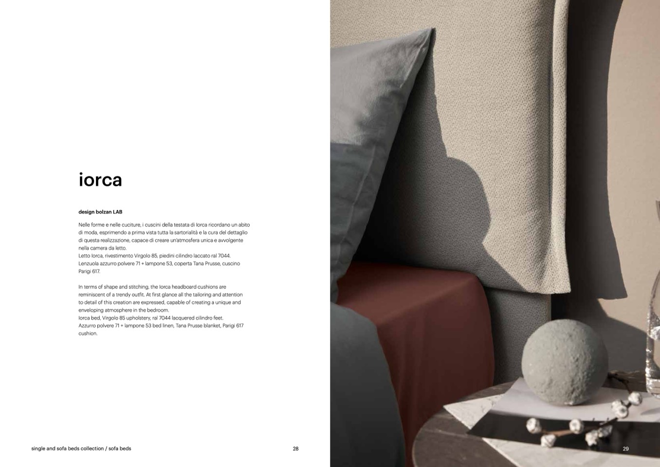 Nelle forme e nelle cuciture, i cuscini della testata di Iorca ricordano un abito