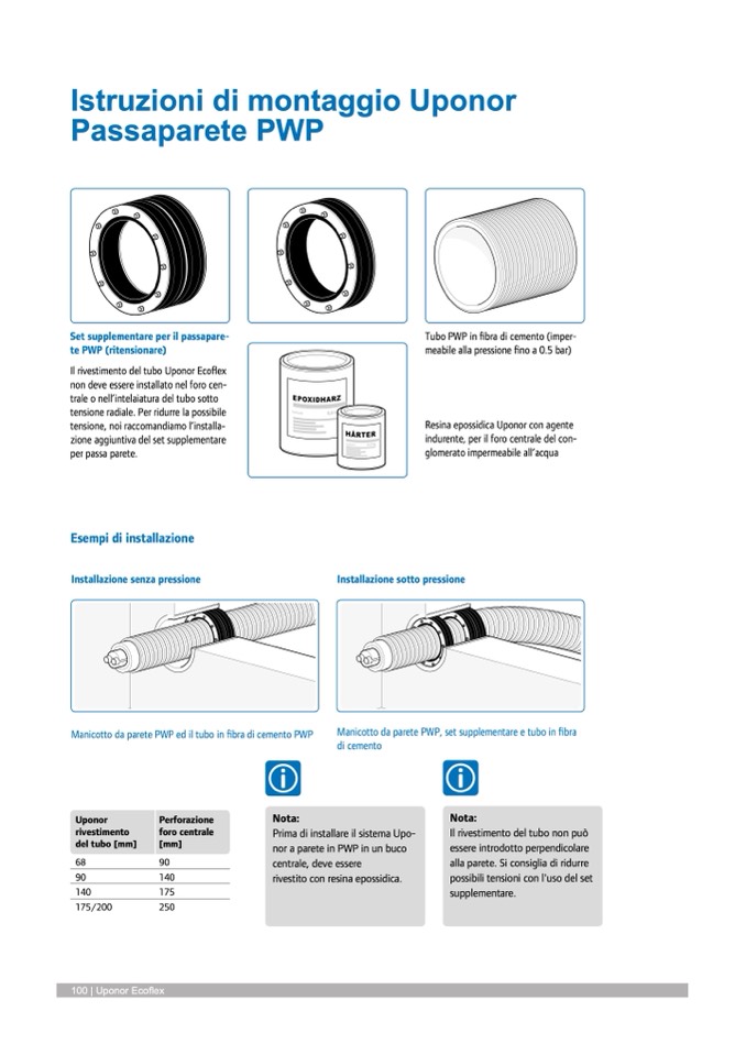 Manicotto da parete PWP, set supplementare e tubo in fibra
