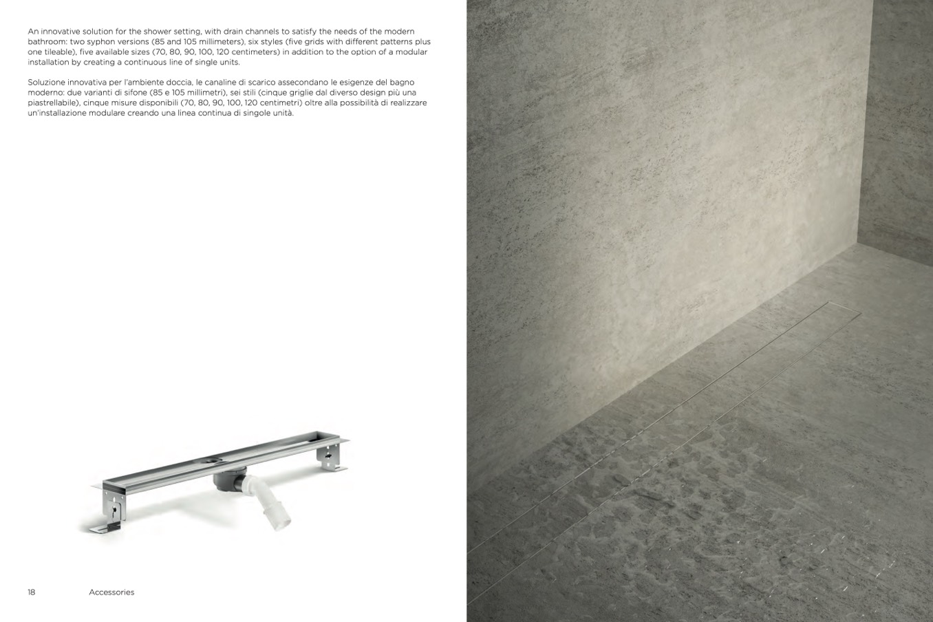 An innovative solution for the shower setting, with drain channels to satisfy the needs of the modern