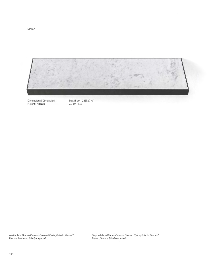 Disponibile in Bianco Carrara, Crema d’Orcia, Gris du Marais®,