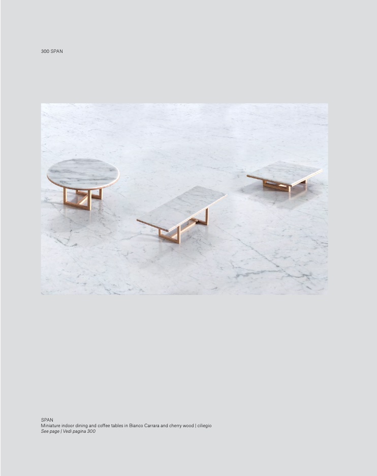 Miniature indoor dining and coffee tables in Bianco Carrara and cherry wood | ciliegio