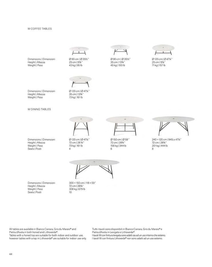 I tavoli W con finitura levigata sono adatti sia ad un uso interno che esterno.