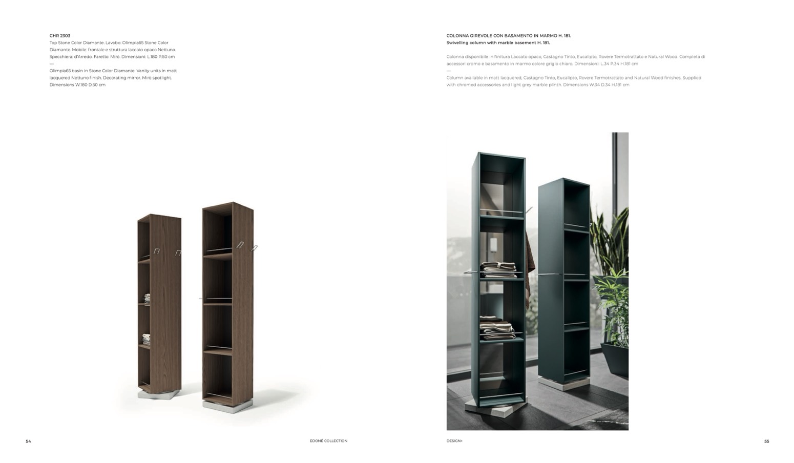 Column available in matt lacquered, Castagno Tinto, Eucalipto, Rovere Termotrattato and Natural Wood finishes. Supplied