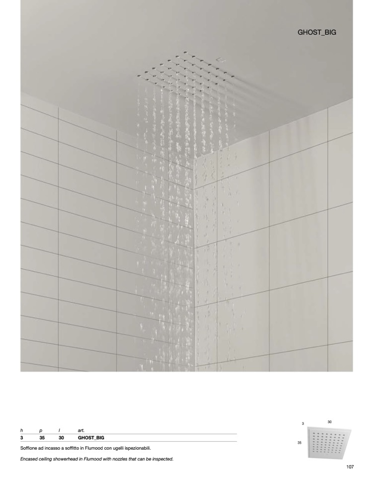 Encased ceiling showerhead in Flumood with nozzles that can be inspected.