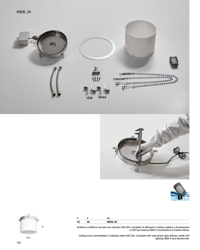 Ceiling mount showerhead in stainless steel AISI 304, complete with matt acrylic light diffuser, white LED