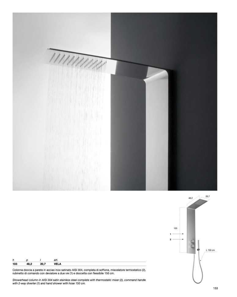 Colonna doccia a parete in acciao inox satinato AISI 304, completa di sof