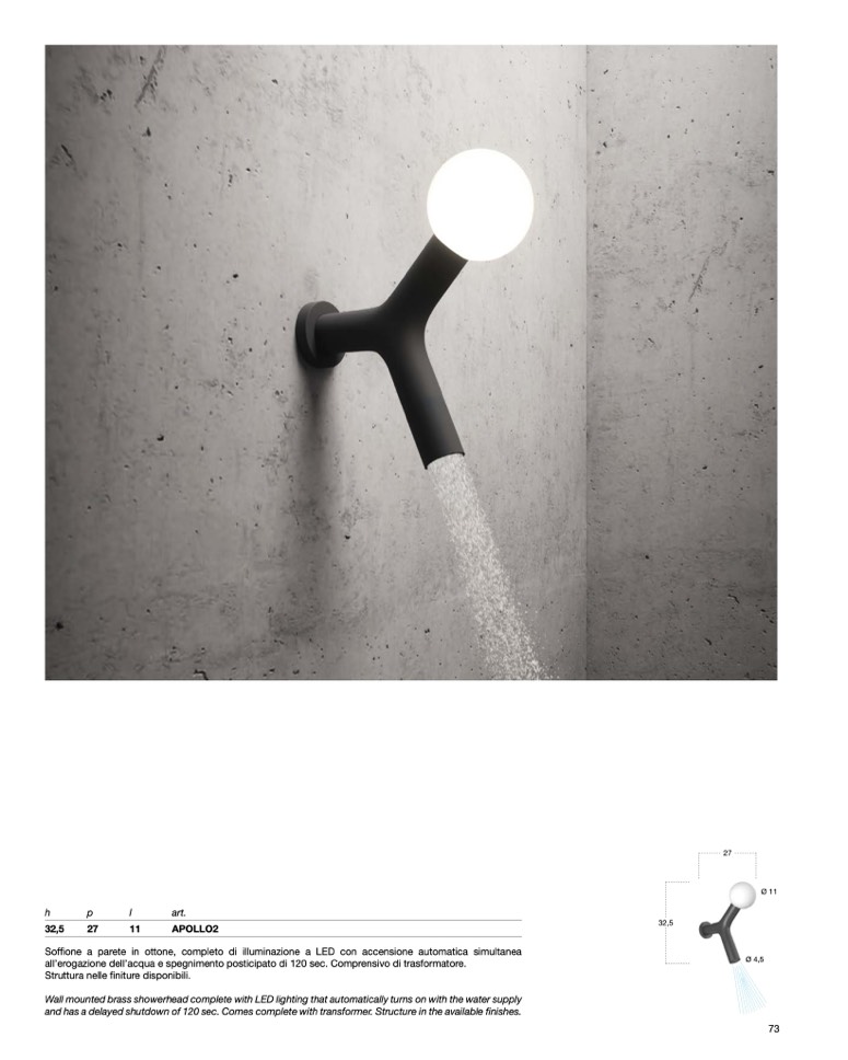 Soffione a parete in ottone, completo di illuminazione a LED con accensione automatica simultanea