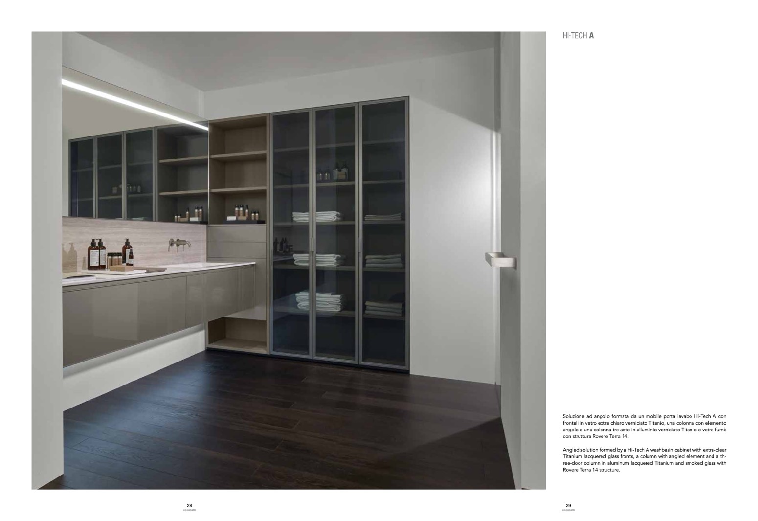 Angled solution formed by a Hi-Tech A washbasin cabinet with extra-clear