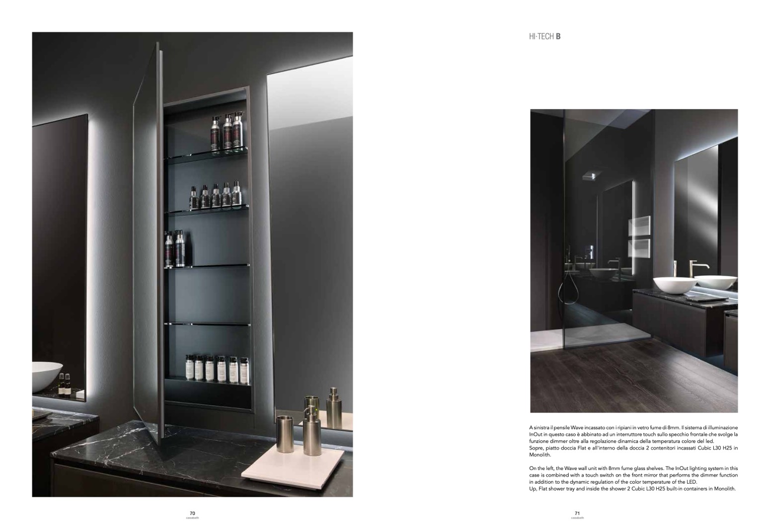 A sinistra il pensile Wave incassato con i ripiani in vetro fume di 8mm. Il sistema di illuminazione