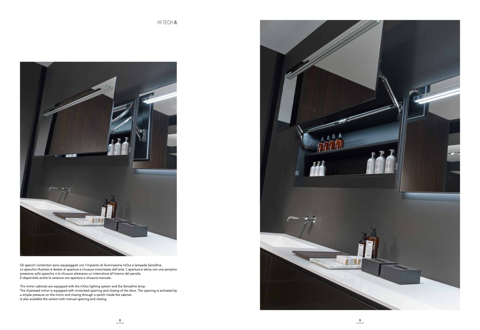 The mirror cabinets are equipped with the InOut lighting system and the Senzafine lamp.