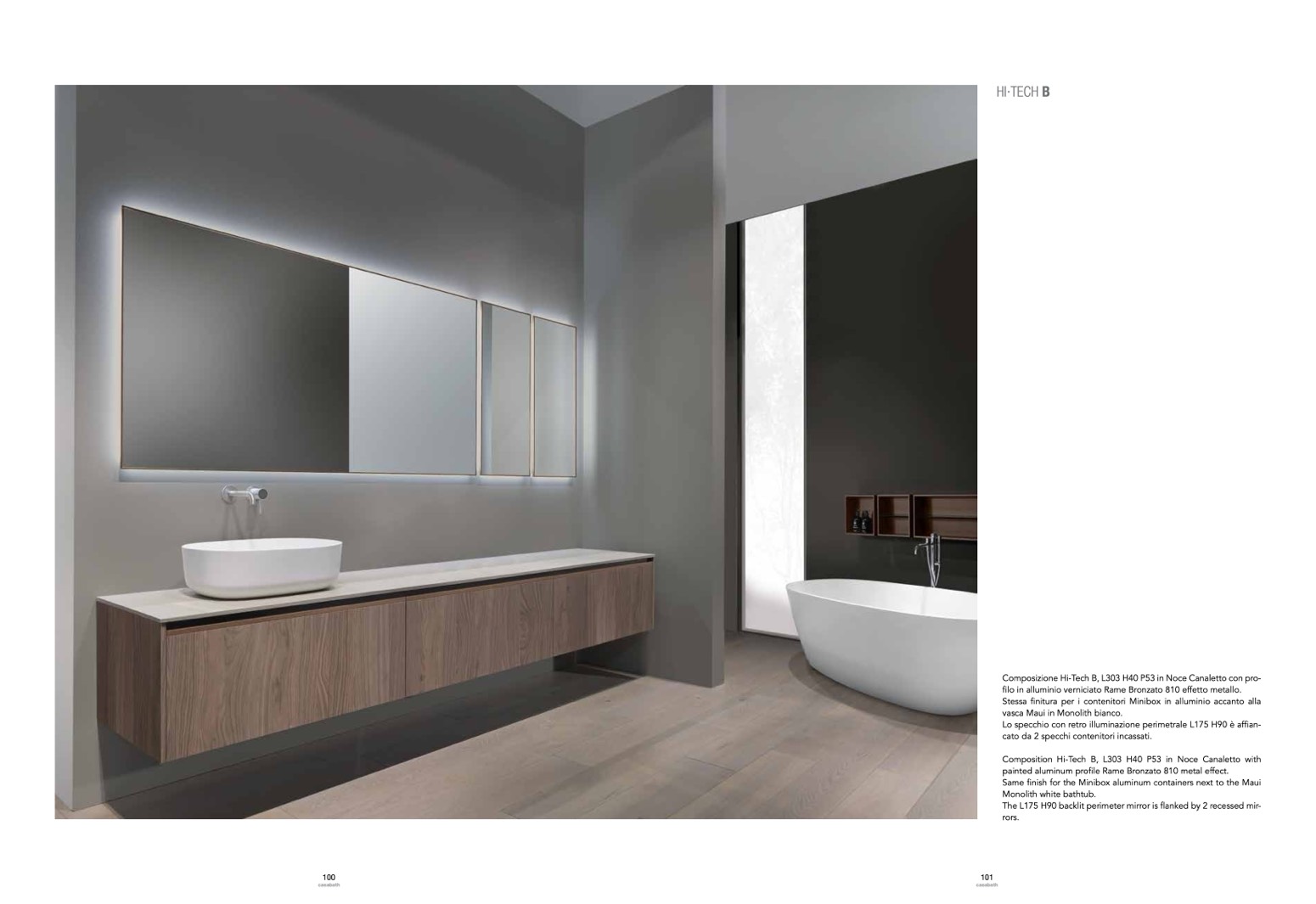 The L175 H90 backlit perimeter mirror is flanked by 2 recessed mir-