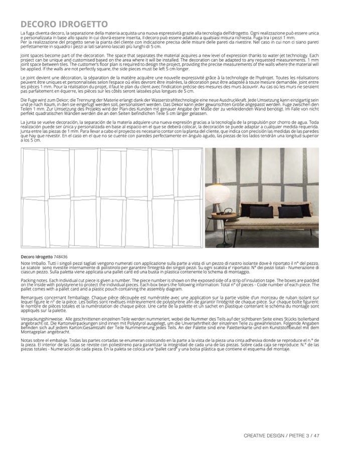 Die Fuge wird zum Dekor; die Trennung der Materie erlangt dank der Wasserstrahltechnologie eine neue Ausdruckkraft. Jede Umsetzung kann einzigartig sein