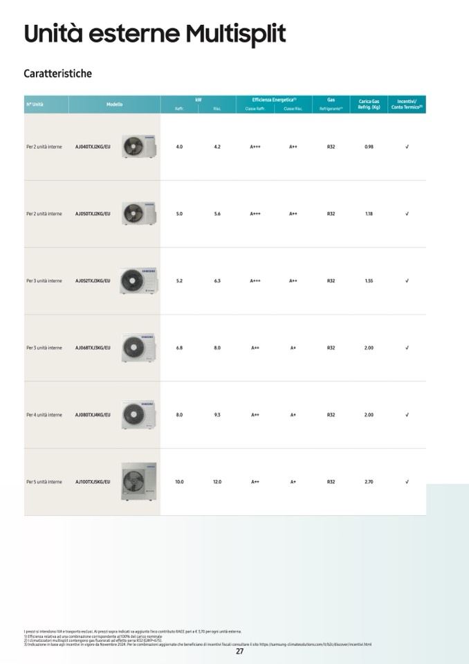 I prezzi si intendono IVA e trasporto esclusi. Ai prezzi sopra indicati va aggiunto l’eco contributo RAEE pari a € 3,70 per ogni unità esterna.