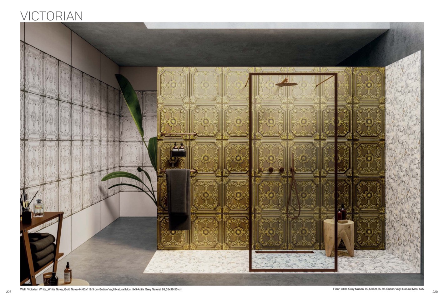 Wall: Victorian White_White Nova_Gold Nova 44,63x119,3 cm-Sutton Vagli Natural Mos. 5x5-Attila Grey Natural 99,55x99,55 cm