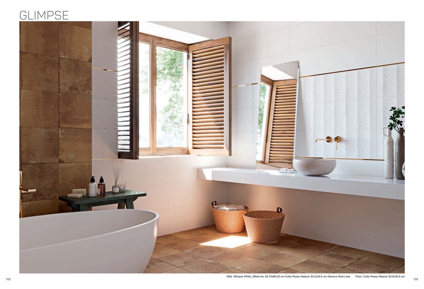Wall: Glimpse White_White Arc 29,75x99,55 cm-Cotto Rosso Natural 30,5x30,5 cm-Geneva Gold Lista