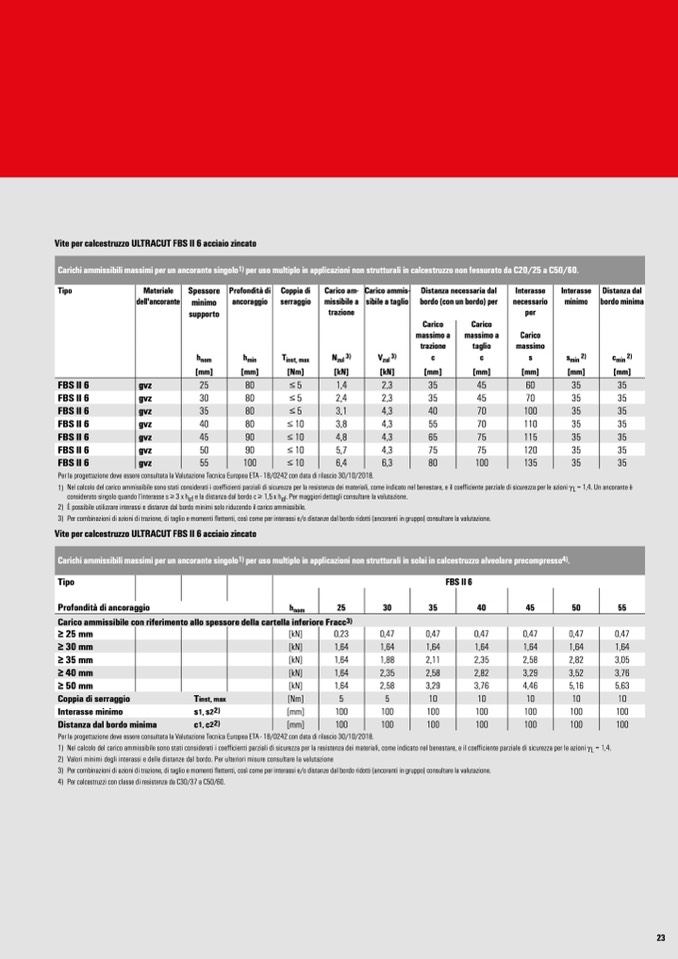 1) Nel calcolo del carico ammissibile sono stati considerati i coefficienti parziali di sicurezza per la resistenza dei materiali, come indicato nel benestare, e il coefficiente parziale di sicurezza per le azioni γL = 1,4. Un ancorante è