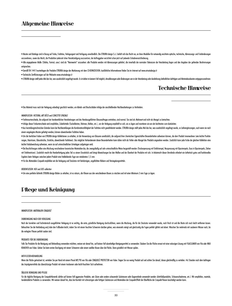 • Muster und Kataloge sind in Bezug auf Farbe, Farbtöne, Verlegungsart and Verfugung unverbindlich. Die ETRURIA design S.r.l. behält sich das Recht vor, an ihren Modellen für notwendig erachtete optische, technische, Abmessungs- und Farbänderungen
