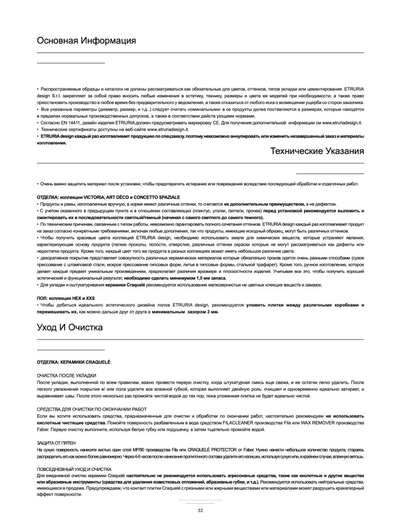 • Распространяемые образцы и каталоги не должны рассматриваться как обязательные для цветов, оттенков, типов укладки или цементирования. ETRURIA