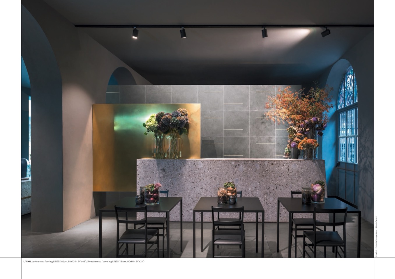 LIVING, pavimento / flooring LINES 1A (cm. 60x120 - 24”x48”), Rivestimento / covering LINES 1B (cm. 60x60 - 24”x24”)