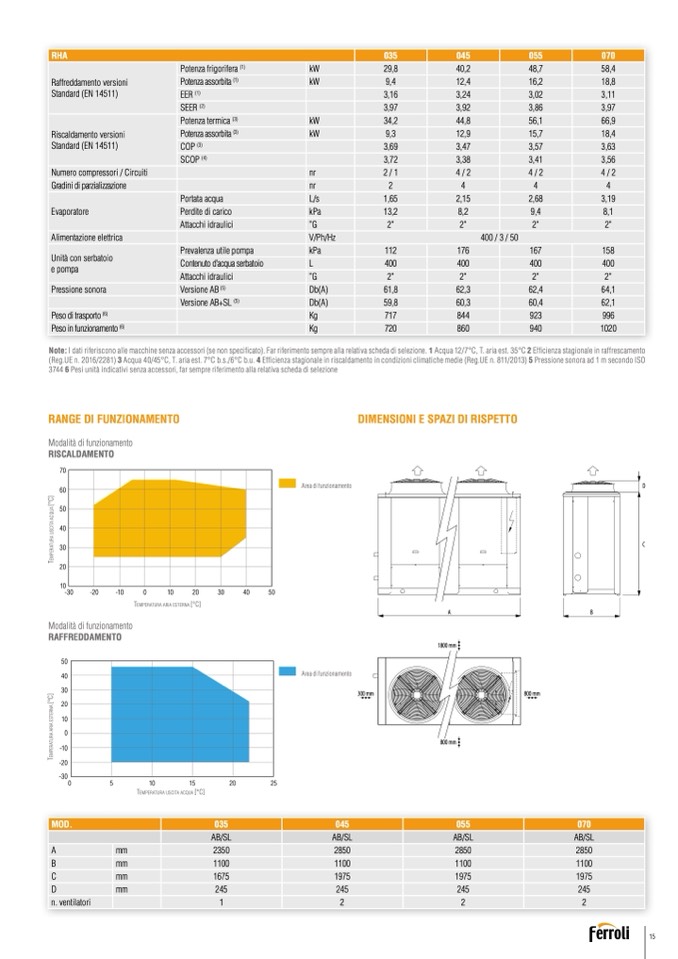 Note: I dati riferiscono alle macchine senza accessori (se non specificato). Far riferimento sempre alla relativa scheda di selezione. 1 Acqua 12/7°C, T. aria est. 35°C 2 Ef