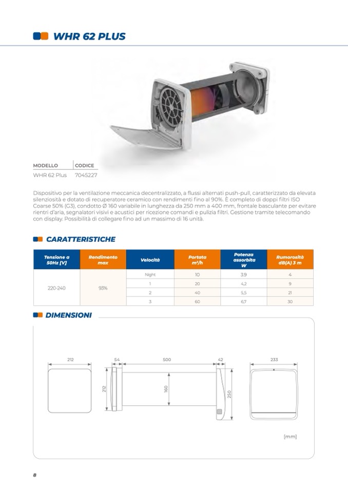 rientri d’aria, segnalatori visivi e acustici per ricezione comandi e pulizia filtri. Gestione tramite telecomando
