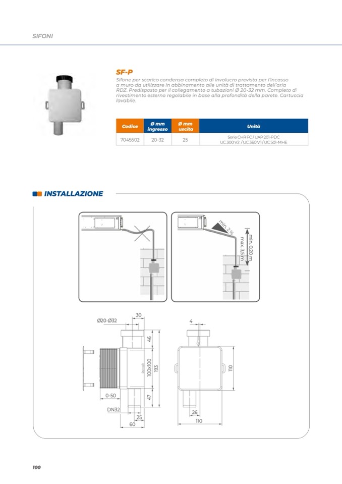 Sifone per scarico condensa completo di involucro previsto per l’incasso