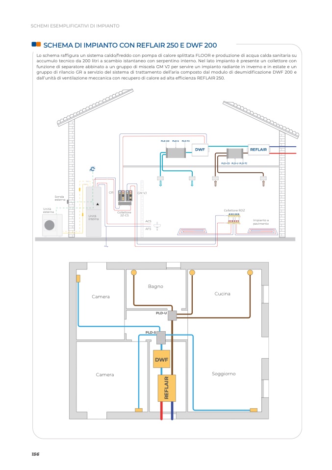 Lo schema raffigura un sistema caldo/freddo con pompa di calore splittata FLOOR e produzione di acqua calda sanitaria su