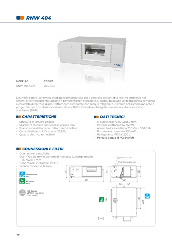 progettato per l’installazione orizzontale a soffitto. Prevedere obbligatoriamente un sifone su scarico
