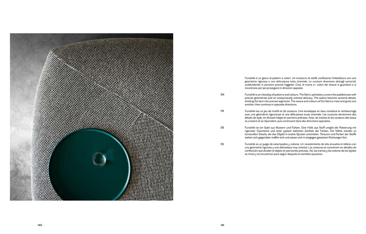 Furoshiki is an interplay of patterns and colours. The fabric upholstery covers the padded seat with