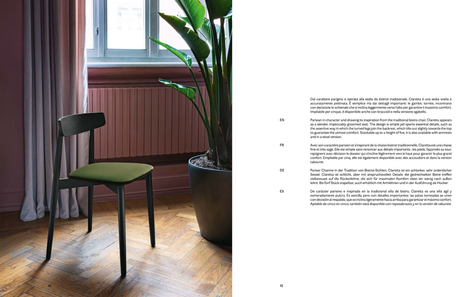 De carácter parisino e inspirada en la tradicional silla de bistro, Claretta es una silla ágil y