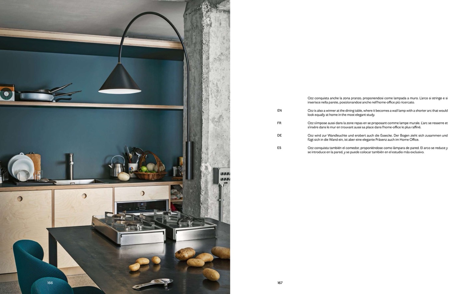 Ozz is also a winner at the dining table, where it becomes a wall lamp with a shorter arc that would