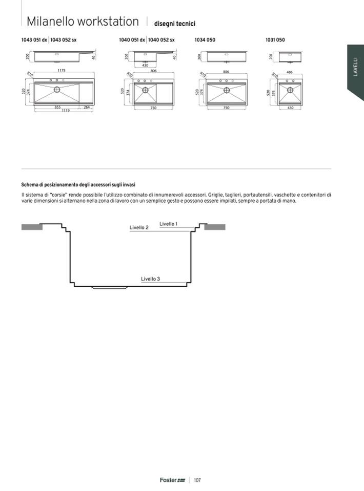Il sistema di “corsie” rende possibile l’utilizzo combinato di innumerevoli accessori. Griglie, taglieri, portautensili, vaschette e contenitori di