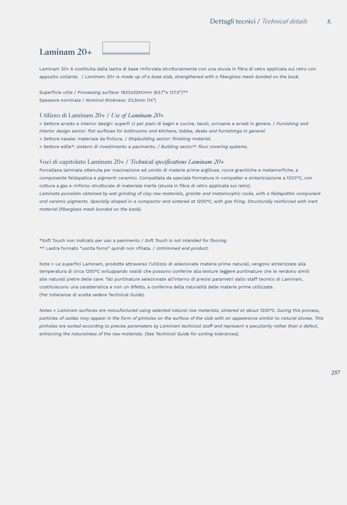 Note > Le superfici Laminam, prodotte attraverso l’utilizzo di selezionate materie prime naturali, vengono sinterizzate alla
